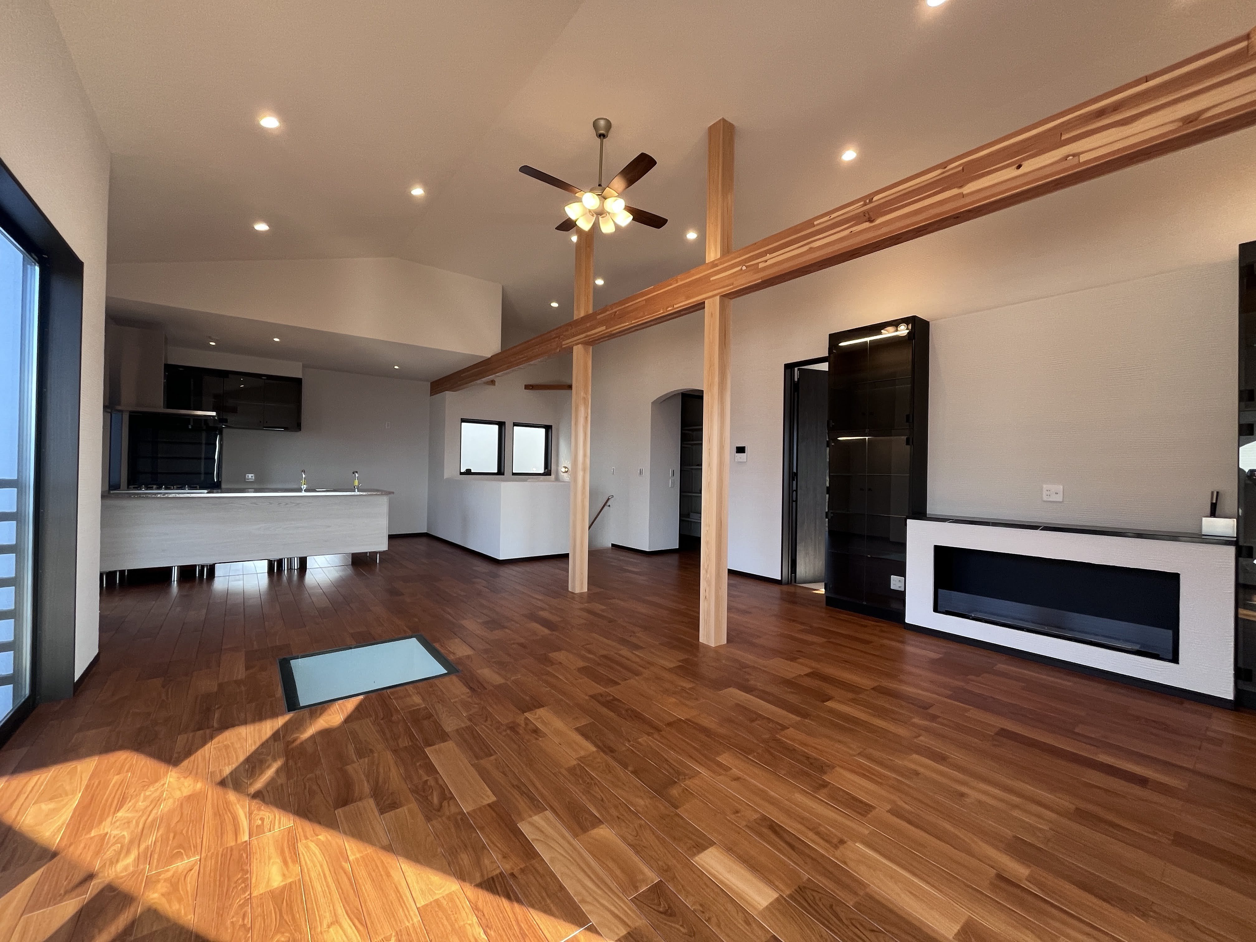30帖と広々したLDKの床材はチークの一枚板を使っています。